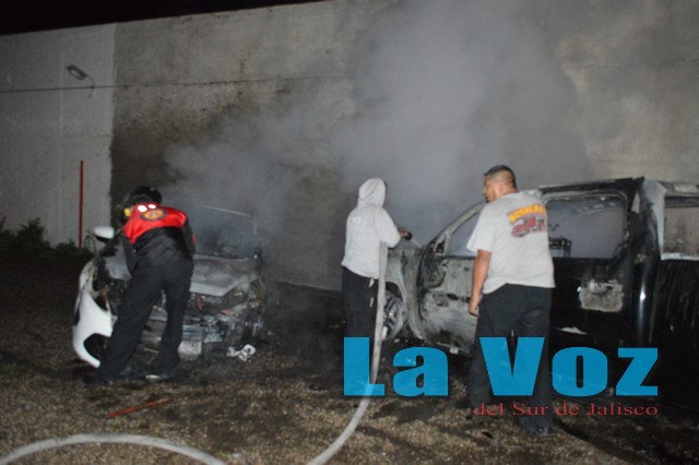 CIUDAD GUZMAN, JAL., (ES).- Cuantiosos daños materiales y una intensa movilización de unidades de emergencia fue el saldo que dejó el incendio de tres vehículos de lujo en el cruce de las calles Galeana y Constitución.